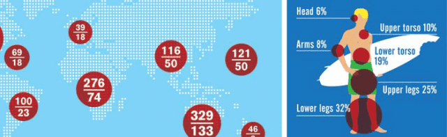 Neste site é possível verificar o número de ataques de tubarão que aconteceram no mundo. De acordo com especialistas, as chances de você ser atacado por um tubarão é de 1 em 11.5 milhões. Os surfistas são os que mais são atacados, pois ficam mais tempo na água e na parte mais funda. A parte do corpo mais atacada são as pernas.