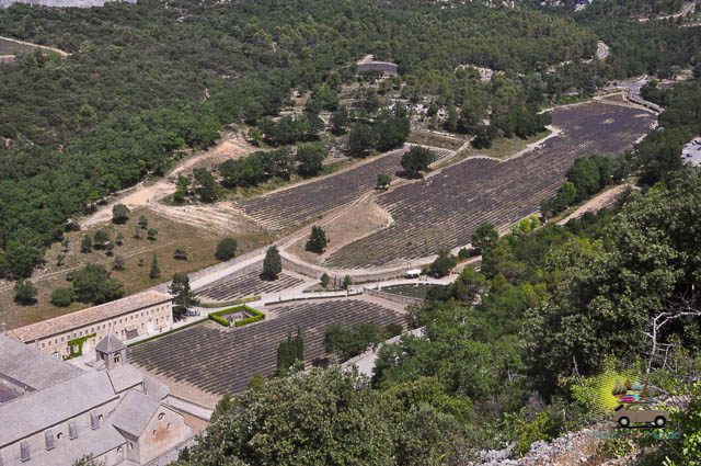 Comece o seu roteiro de carro de um dia indo até a Abadia de Sénanque. Para chegar lá, você terá que primeiro subir uma montanha para depois descer e a vista que você tem descendo é de cair o queixo.