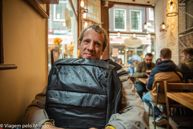 Eu, o Fabio e o Wurst chegamos em Amsterdam e começou a chover. O clima não estava ajudando e a gente ainda estava com fome e sem disposição de ficar zanzando pela cidade molhados. O Wurst, por sua vez, teve que ficar na mochila dele, pois seria impossível ele ficar seco e limpo caminhando nessas condições.